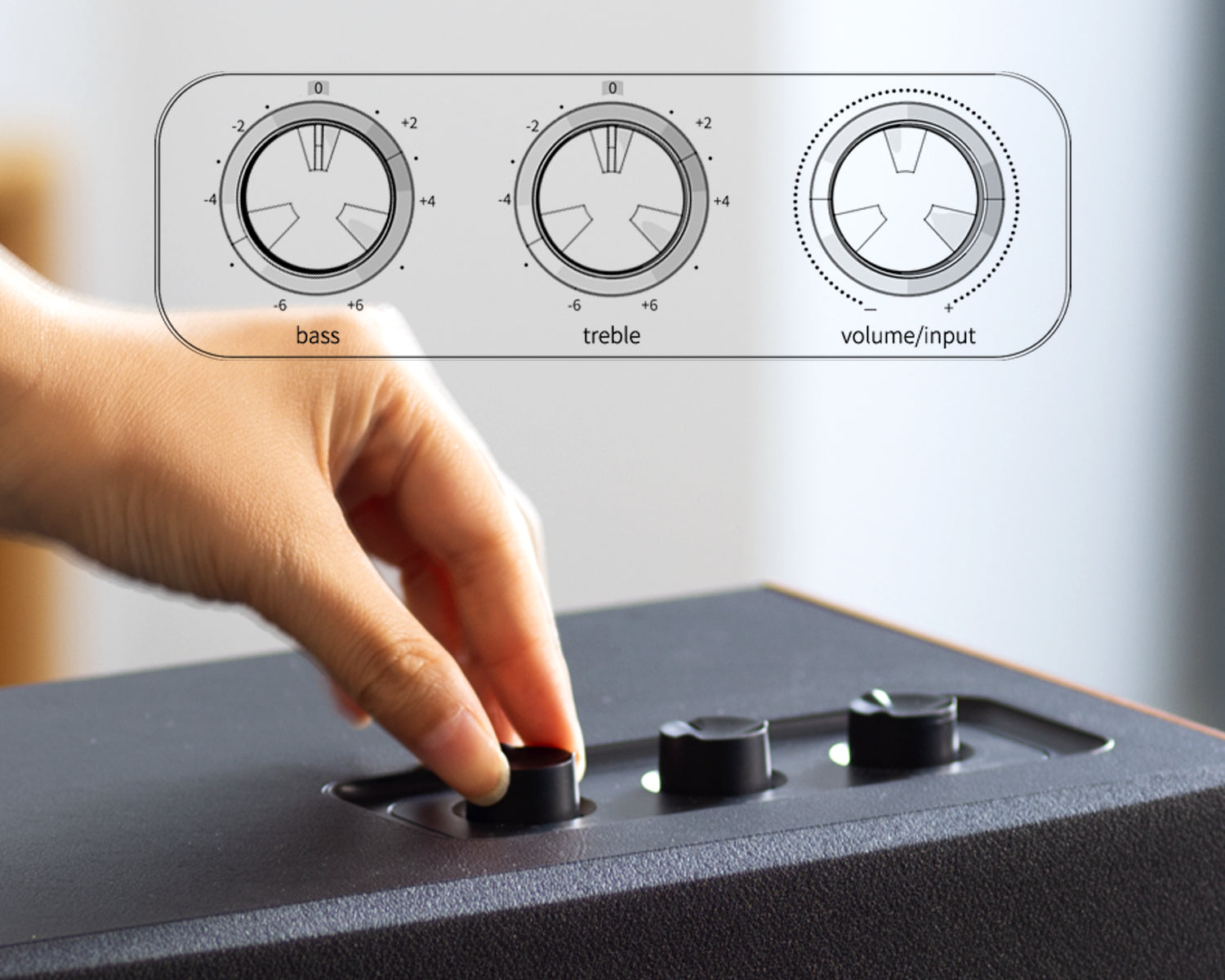 เปลี่ยนแหล่งสัญญาณเสียง ปรับระดับเสียง หรือเลือกโหมด EQ ได้อย่างสะดวก เพียงหมุนปุ่มควบคุม ไม่ต้องพึ่งรีโมตหรือปุ่มหลายจุดให้ยุ่งยาก