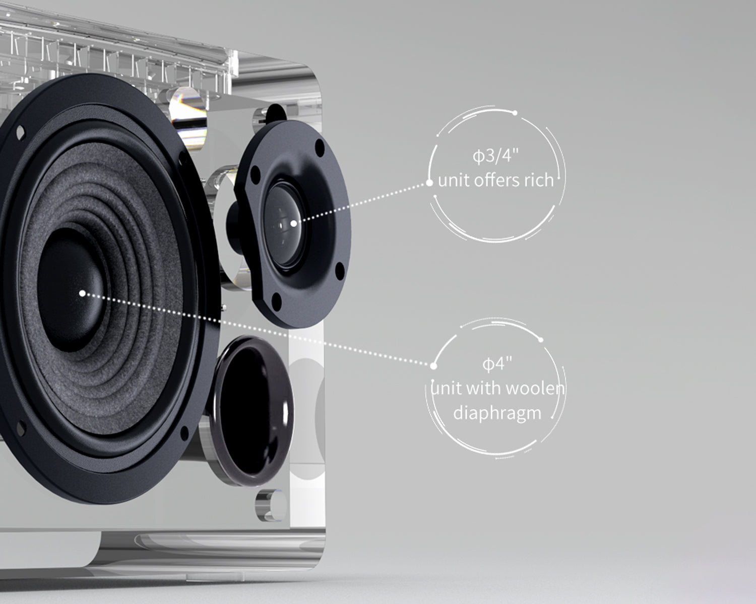 ด้วยยูนิตเสียงแหลมขนาด 3/4 นิ้วให้เสียงที่นุ่มนวลไม่บาดหู และยูนิตเบสขนาด 4 นิ้วพร้อมไดอะแฟรมขนแกะให้เสียงทุ้มลึก กระหึ่ม น่าประทับใจในทุกจังหวะ