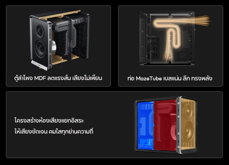 ตู้ลำโพง MDF แข็งแรง พร้อมเทคโนโลยี MazeTube ช่วยเพิ่มเสียงเบส
