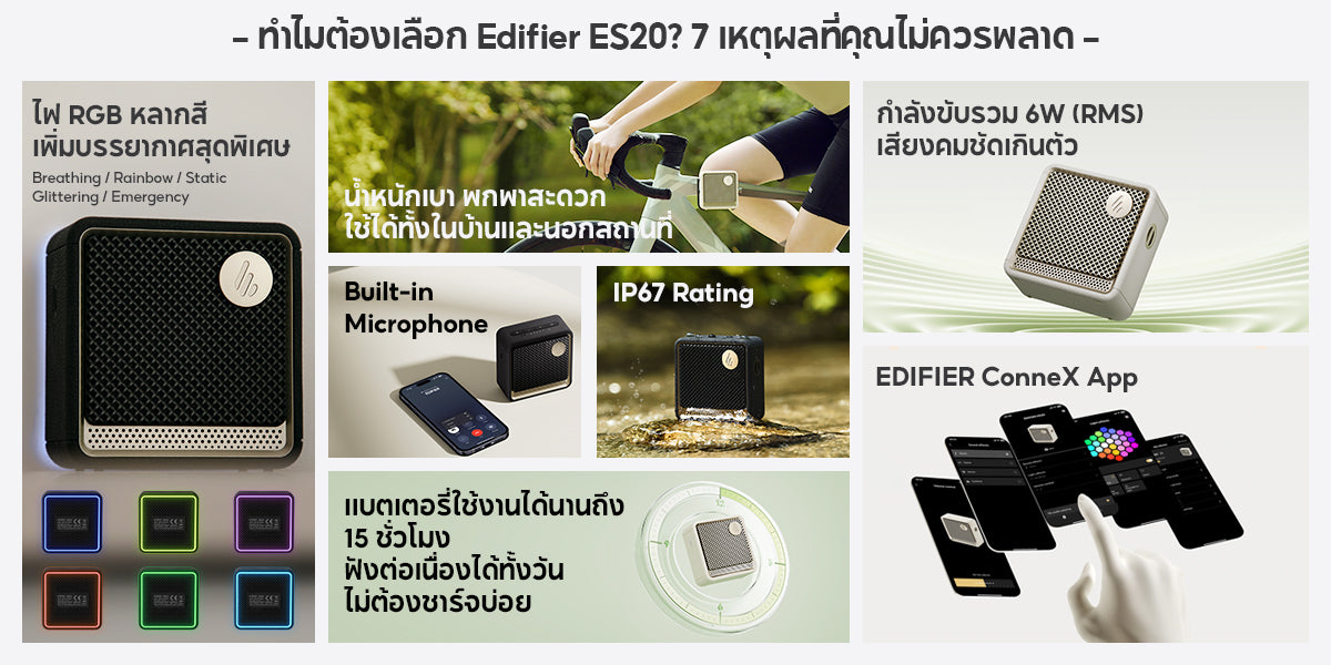 EDIFIER ES20 เป็นลำโพงบลูทูธแบบพกพาที่มีดีไซน์สวยทันสมัย มาพร้อมไฟเอฟเฟกต์สร้างบรรยากาศ กันน้ำกันฝุ่นระดับ IP67 เชื่อมต่อเสถียรด้วย Bluetooth® V5.4 ใช้งานได้ทุกที่ทุกเวลา