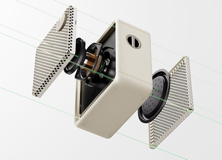 ไดรเวอร์ขนาด 43 มม. พร้อมแม่เหล็กนีโอไดเมียม และแผ่นกระจายเสียงขนาด 55 มม. ให้พลังเสียง 6W (RMS) ด้วยแอมป์ Class-D
