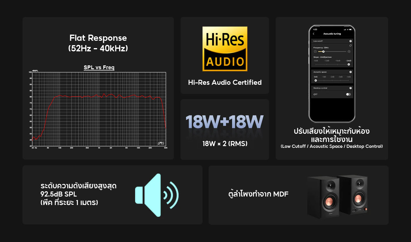 - 【เสียงแม่นยำระดับสตูดิโอ】: ตอบสนองความถี่แบบ Flat 52Hz–40kHz ให้รายละเอียดเสียงชัดทุกย่าน พร้อมกำลังขับรวม 18W × 2 และ SPL สูงสุด 92.5dB