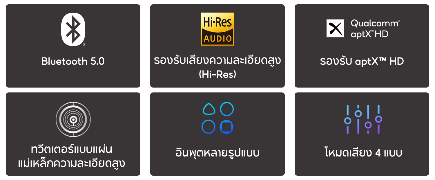 • 【รองรับ Hi-Res Audio และ aptX™ HD】: เพลิดเพลินกับเสียงคุณภาพสูงด้วยความละเอียดสูงสุด 24bit/192kHz ผ่าน Bluetooth 5.0 พร้อมเทคโนโลยี Qualcomm® aptX™ HD