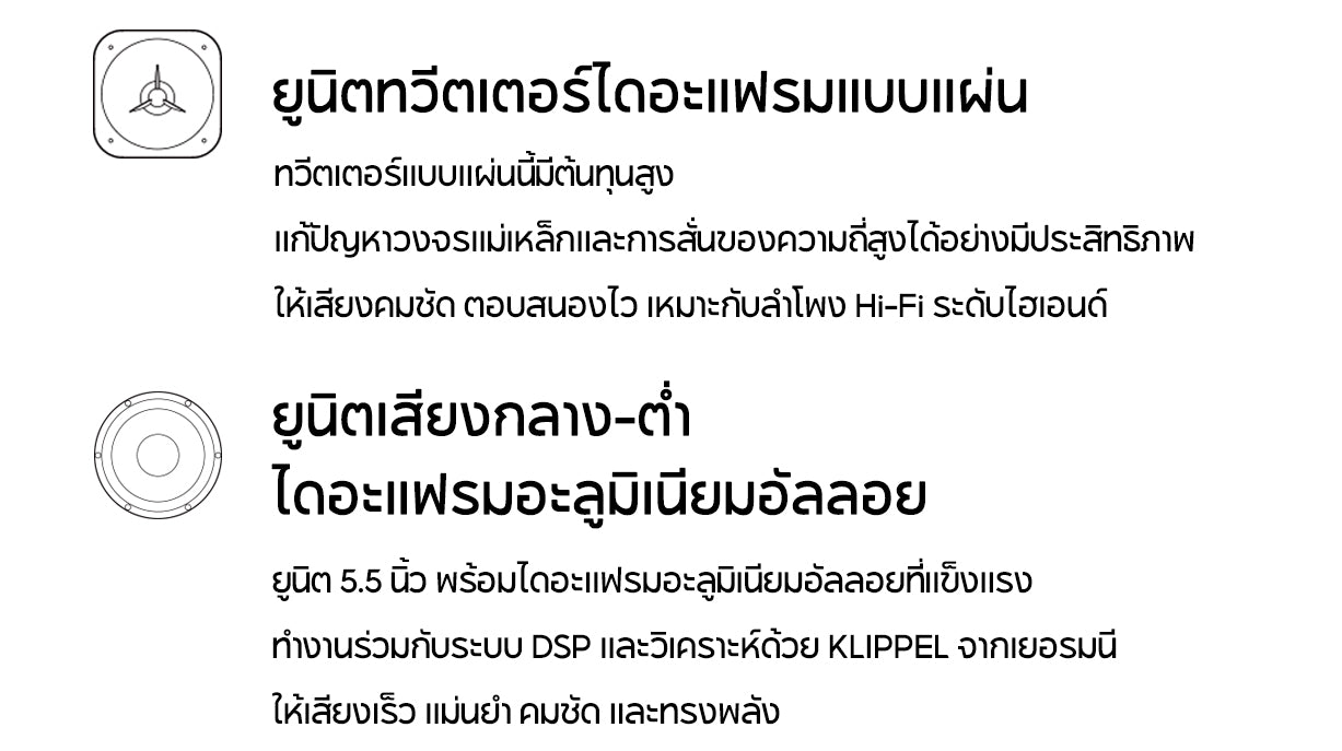 • 【ประมวลผลเสียงด้วยชิป DSP จาก TI】: ใช้ชิปประมวลผลเสียง DSP จาก Texas Instruments เพื่อควบคุมจุดตัดความถี่อย่างแม่นยำ และถ่ายทอดรายละเอียดเสียงได้สมจริงยิ่งขึ้น