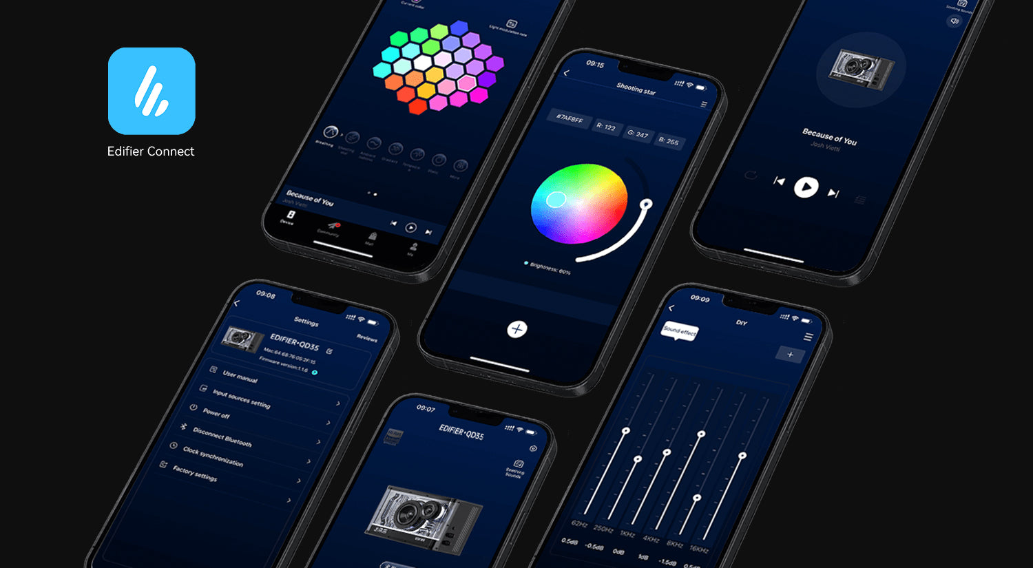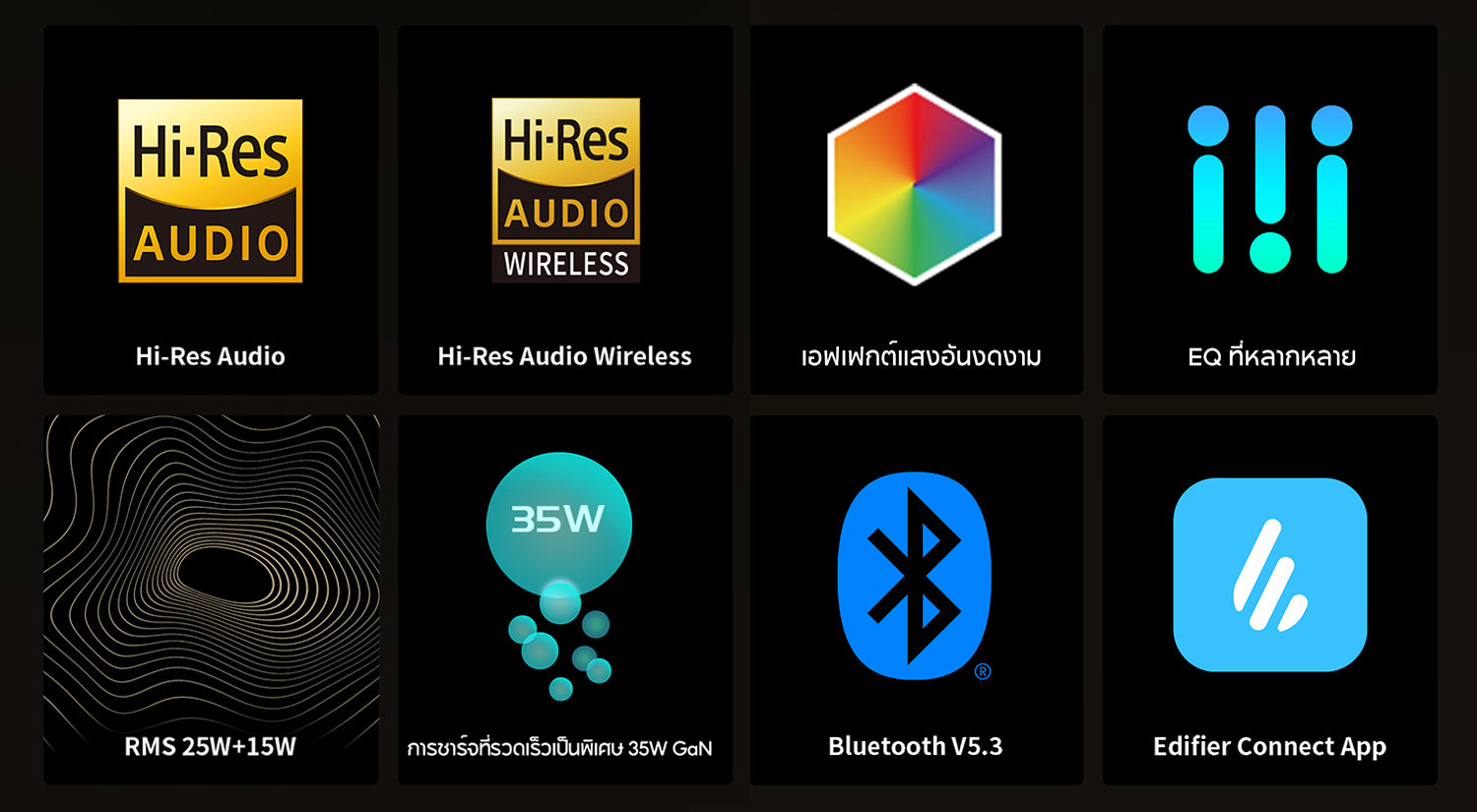 มีเอฟเฟกต์ไฟให้เลือกหลากหลายแบบสำเร็จรูป และสามารถปรับแต่งเอฟเฟกต์ไฟเองได้ผ่านแอป Edifier Connect เติมสีสันให้โต๊ะของคุณ และสร้างบรรยากาศที่ตรงใจ