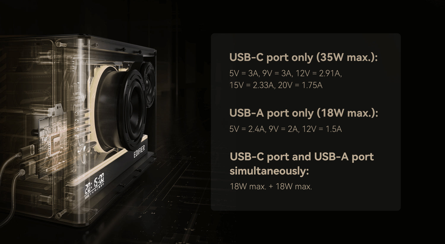 โครงสร้างเสียงคุณภาพสูง ได้รับการรับรอง Hi-Res Audio และ Hi-Res Audio Wireless พร้อมรองรับ LDAC มาพร้อมเอฟเฟกต์ไฟล่วงหน้าและปรับแต่งได้อย่างงดงาม มีพอร์ต USB สองช่อง รองรับการชาร์จที่ปลอดภัยและมีประสิทธิภาพสูง ด้วยเทคโนโลยี TurboGaN