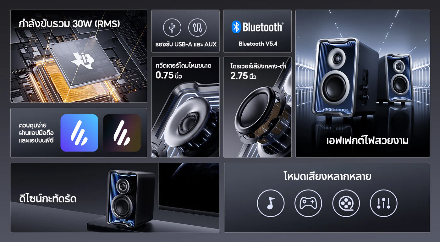 - 【เสียงคมชัดด้วยกำลังขับ 30W RMS】:ลำโพงมาพร้อมแอมป์ Class-D ประสิทธิภาพสูง ขับเสียงจากทวีตเตอร์โดมไหม 0.75 นิ้ว และมิดเบสอะลูมิเนียม 2.75 นิ้ว ให้เสียงสมดุลในทุกความถี่
