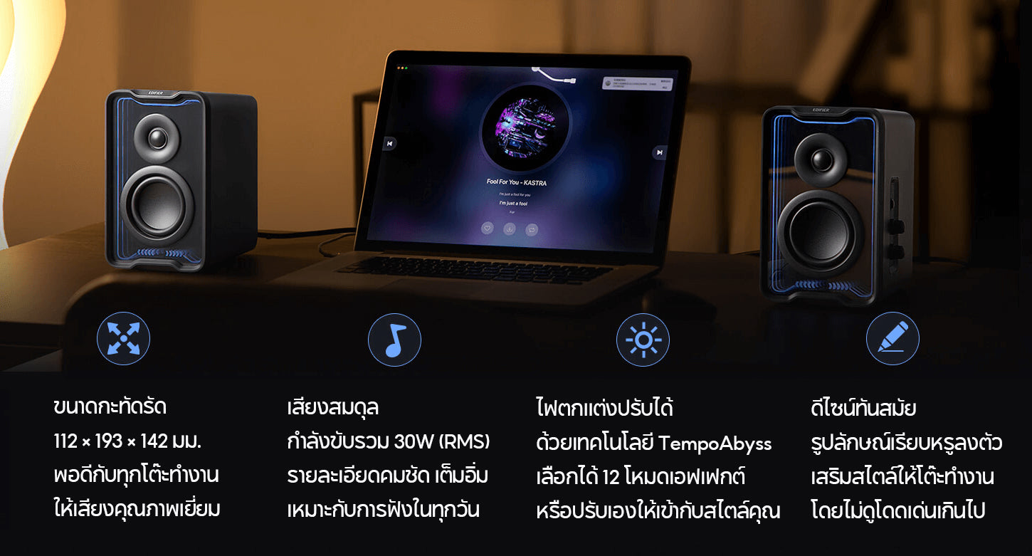- 【ควบคุมสะดวกทั้งเสียงและไฟ】:ปรับระดับเสียงและเอฟเฟกต์แสงผ่านปุ่มควบคุมด้านข้าง หรือแอป EDIFIER ConneX และ EDIFIER TempoHub บนคอมพิวเตอร์