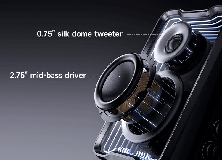 มาพร้อมไดรเวอร์เสียงกลาง-ต่ำ 2.75 นิ้ว และทวีตเตอร์โดมไหม 0.75 นิ้ว ขับเคลื่อนด้วยแอมป์ Class-D จาก Texas Instruments ให้พลังเสียง 30W (RMS) เต็มอิ่ม ครบทุกมิติในดีไซน์ขนาดกะทัดรัด