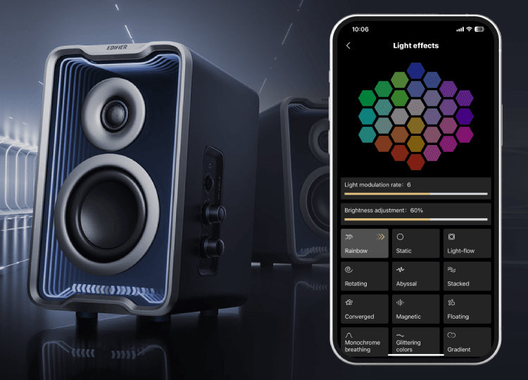 • 【ควบคุมสะดวกทั้งเสียงและไฟ】ปรับระดับเสียงและเอฟเฟกต์แสงผ่านปุ่มควบคุมด้านข้าง หรือแอป EDIFIER ConneX และ EDIFIER TempoHub บนคอมพิวเตอร์
