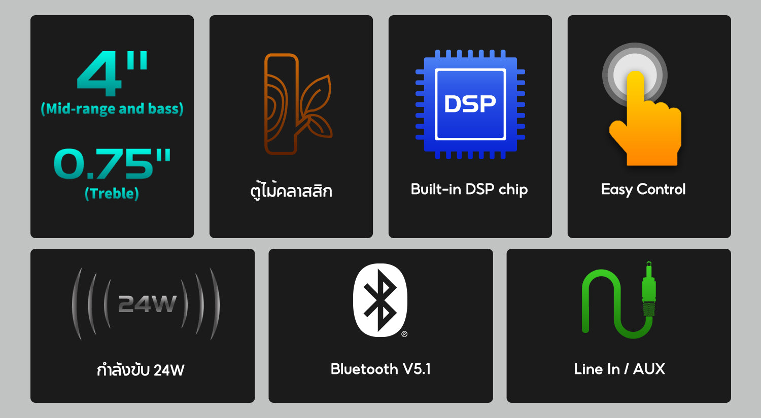 ลำโพงมาพร้อมไดรเวอร์ 4 ชุด กำลังขับรวม 24 วัตต์ (RMS) ให้เสียงกระจายได้ทั่วทุกมุมของบ้าน มอบประสบการณ์การฟังเพลงที่ชัดเจนและประทับใจ