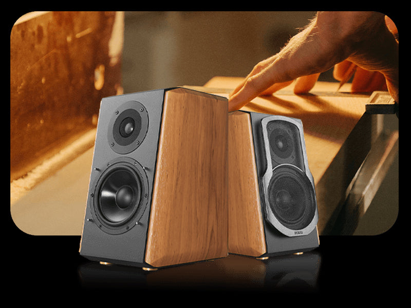 ตู้ลำโพงไม้แข็งแรงช่วยลดแรงสั่นสะเทือน และแผงหน้าที่เอียงเล็กน้อยช่วยส่งเสียงตรงถึงหูอย่างแม่นยำ