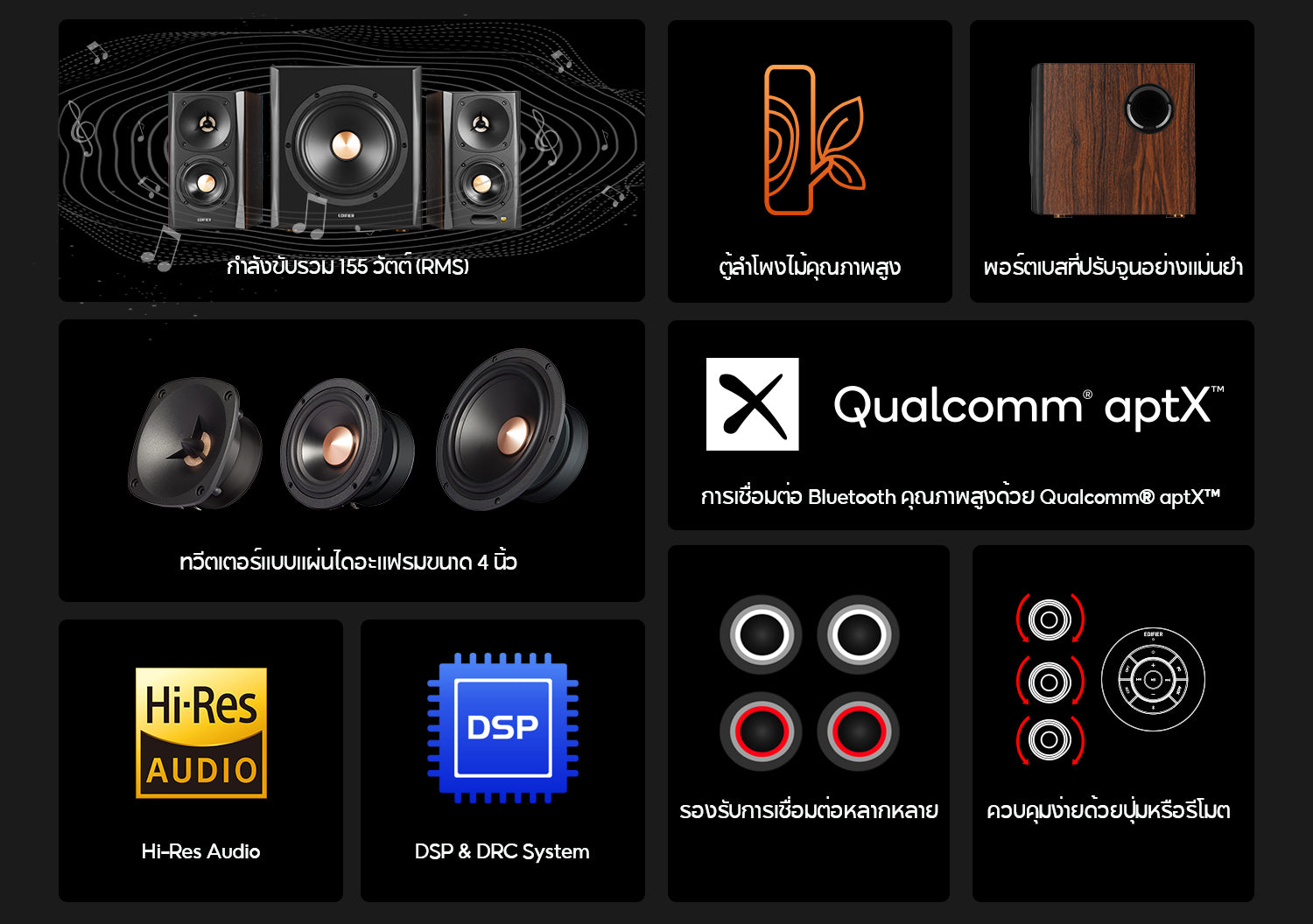 • 【ควบคุมสะดวกทั้งจากเครื่องและรีโมต】มีปุ่มปรับเสียงที่ตัวเครื่อง รีโมตไร้สาย และรองรับแอป EDIFIER ConneX