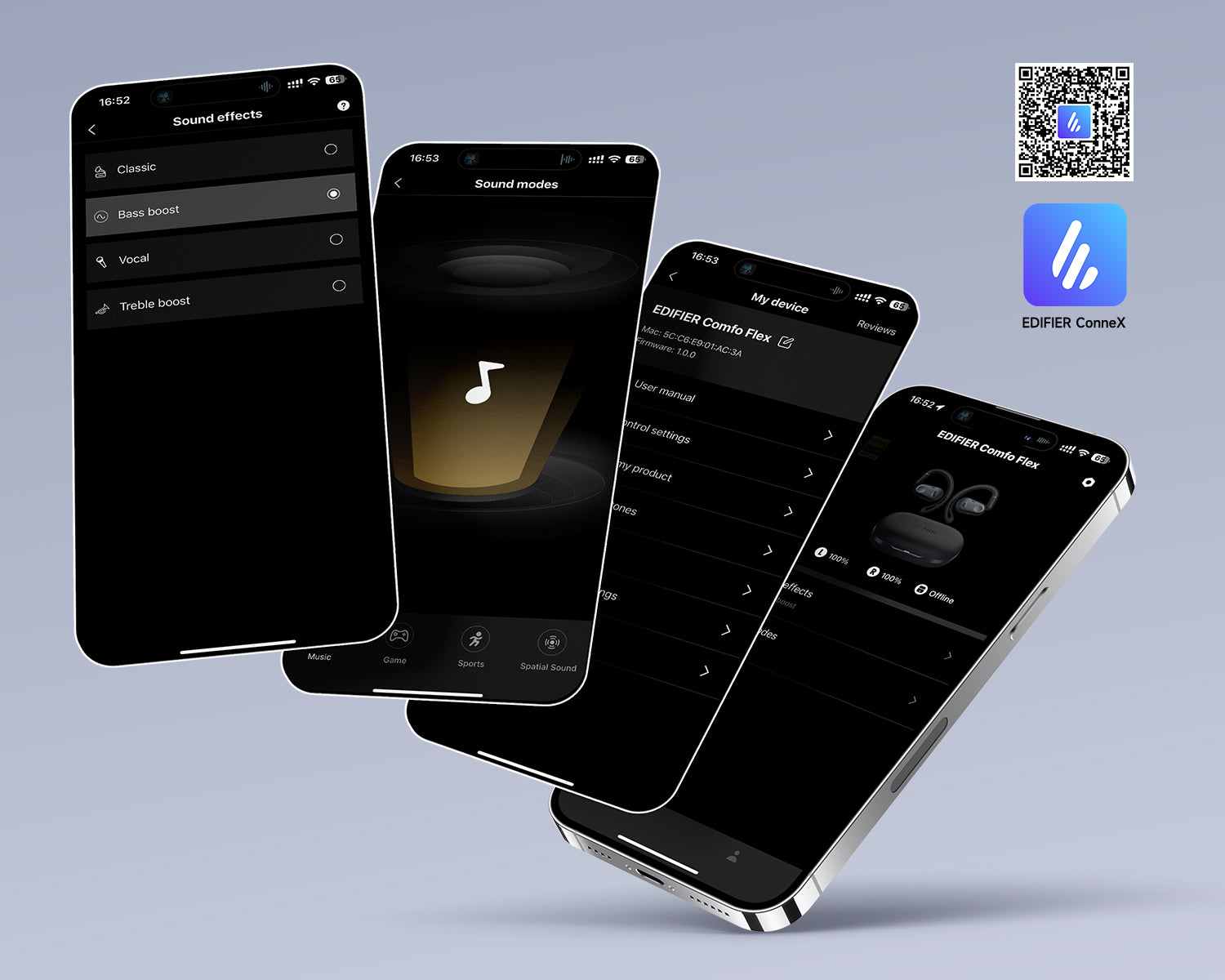 • 【ควบคุมง่ายผ่านแอป EDIFIER ConneX】: ตั้งค่าการควบคุม เอฟเฟกต์เสียง ค้นหาหูฟัง และฟีเจอร์เสริมอื่น ๆ ได้ผ่านแอป EDIFIER ConneX