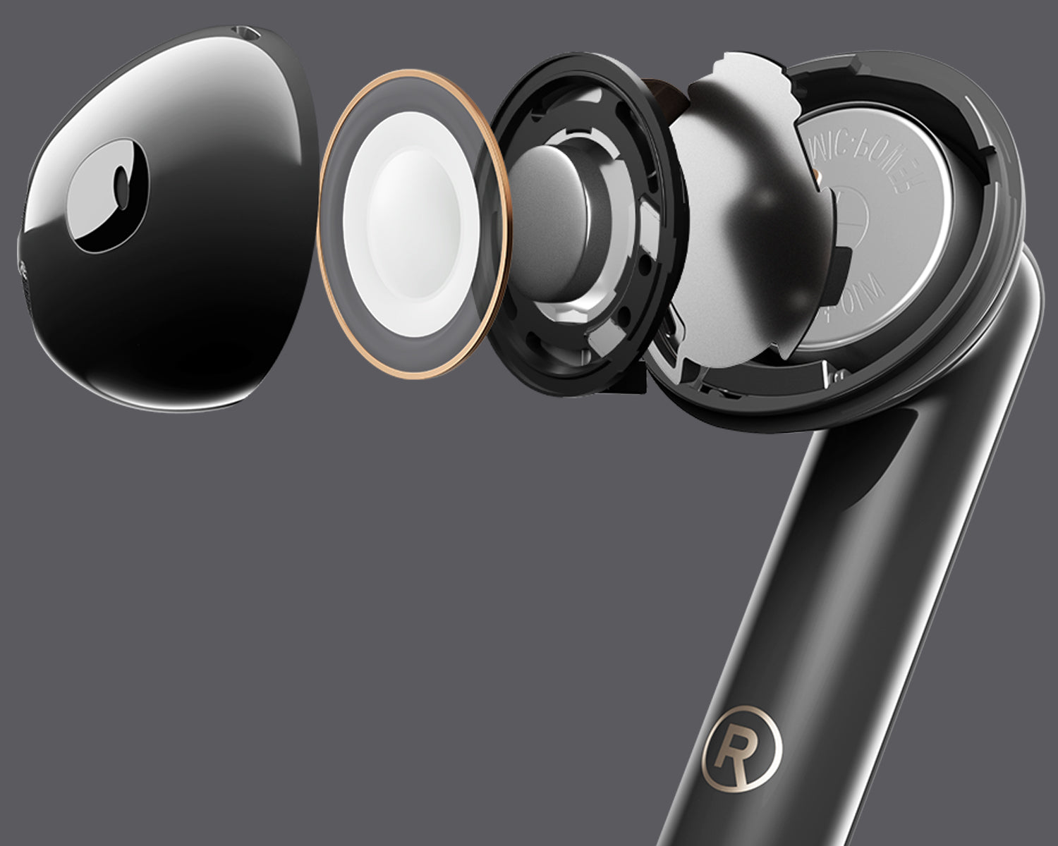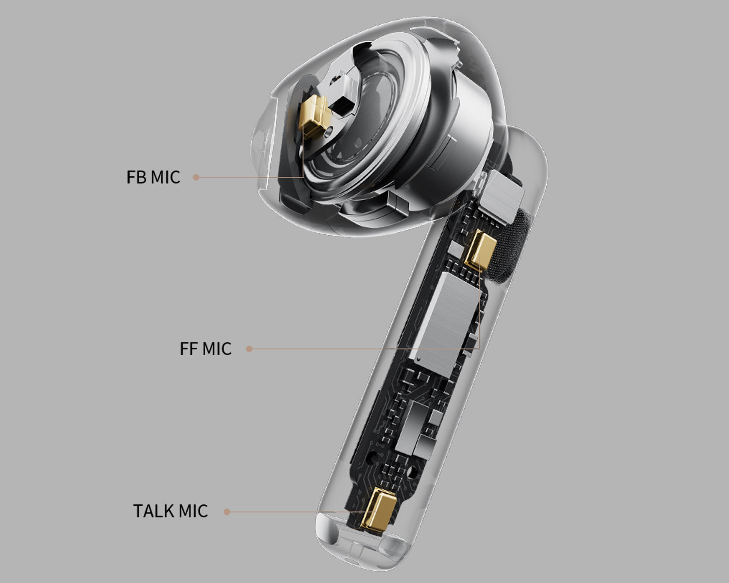 หูฟังแต่ละข้างมีไมโครโฟน 3 ตัว ทั้งสำหรับการป้อนกลับและการโทร พร้อมระบบ AI ที่ตรวจจับเสียงรบกวนรอบข้างและปรับการตัดเสียงอย่างเหมาะสม ทำให้เสียงพูดชัดเจน แม้อยู่ในที่เสียงดัง