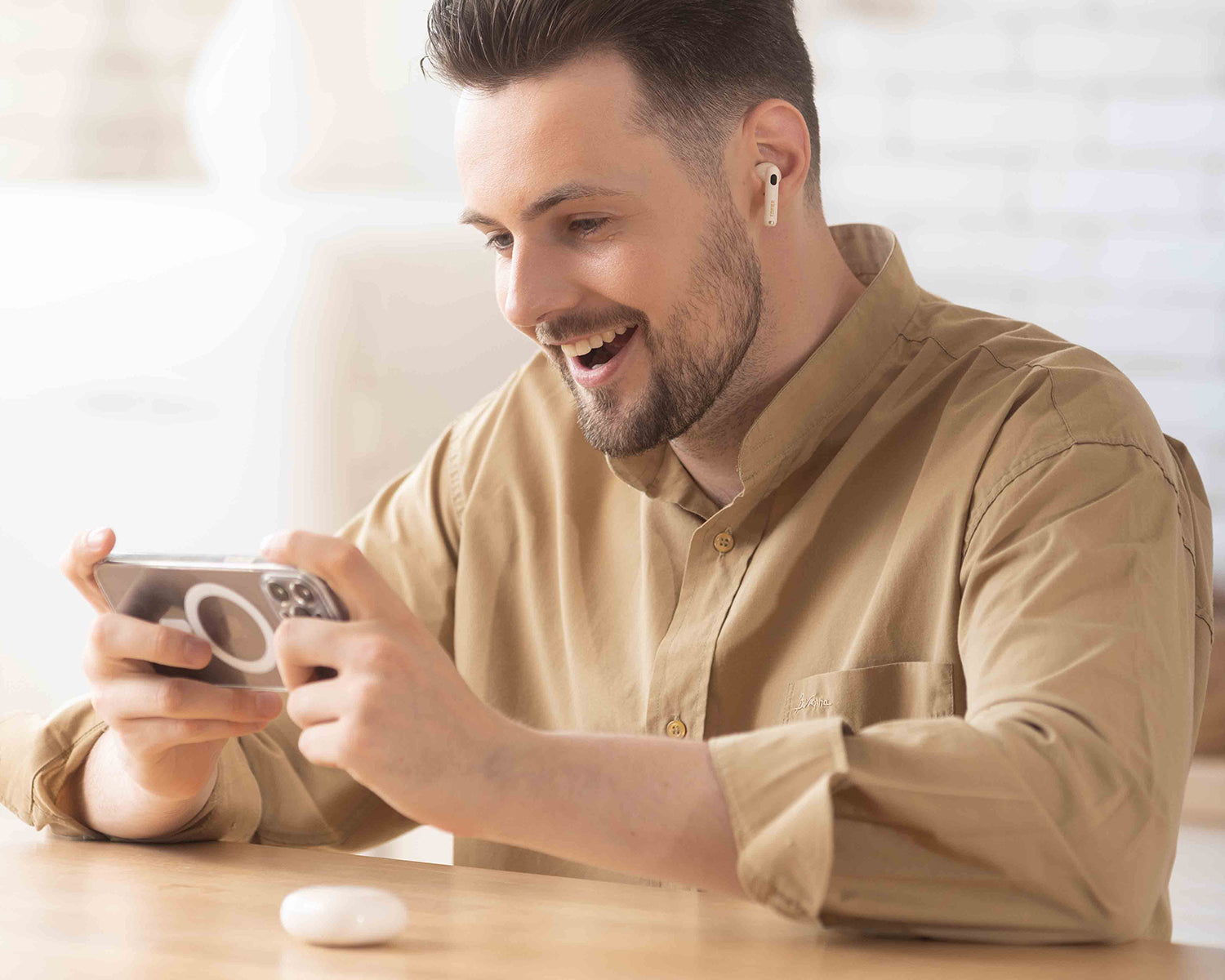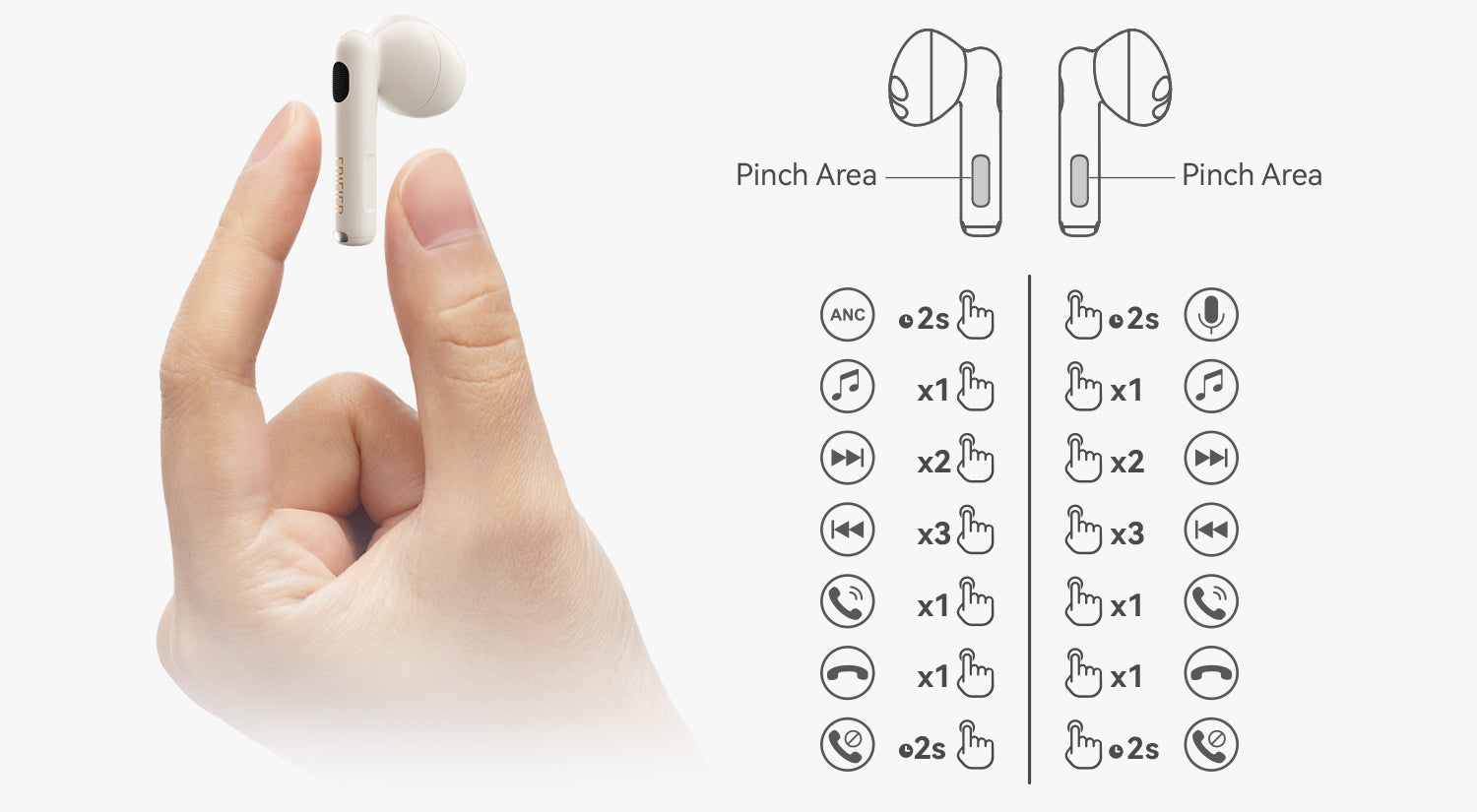 W320TN มาพร้อมระบบควบคุมแบบบีบที่แม่นยำ ลดโอกาสสัมผัสโดยไม่ตั้งใจ เพียงบีบก้านหูฟังก็สามารถรับสาย วางสาย ควบคุมเพลง หรือเปลี่ยนโหมดได้อย่างสะดวก