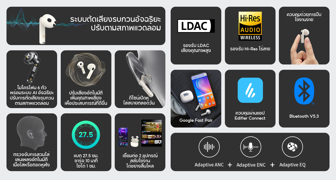 - 【Adaptive ANC ปรับอัตโนมัติ】: ระบบตัดเสียงรบกวนปรับระดับเองตามสภาพแวดล้อม พร้อมเลือกโหมดเองได้ผ่านแอป EDIFIER ConneX