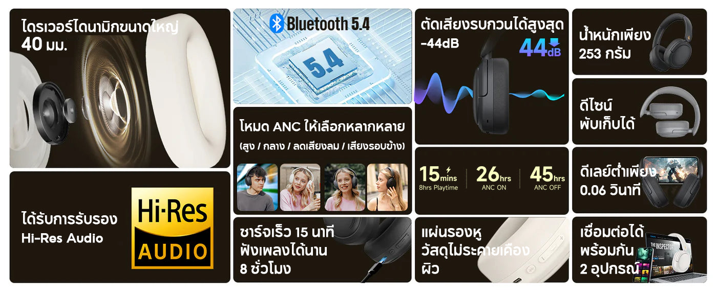 • [Bluetooth 5.4]: การเชื่อมต่อที่เสถียร พร้อม Multipoint เชื่อมต่อ 2 อุปกรณ์พร้อมกัน