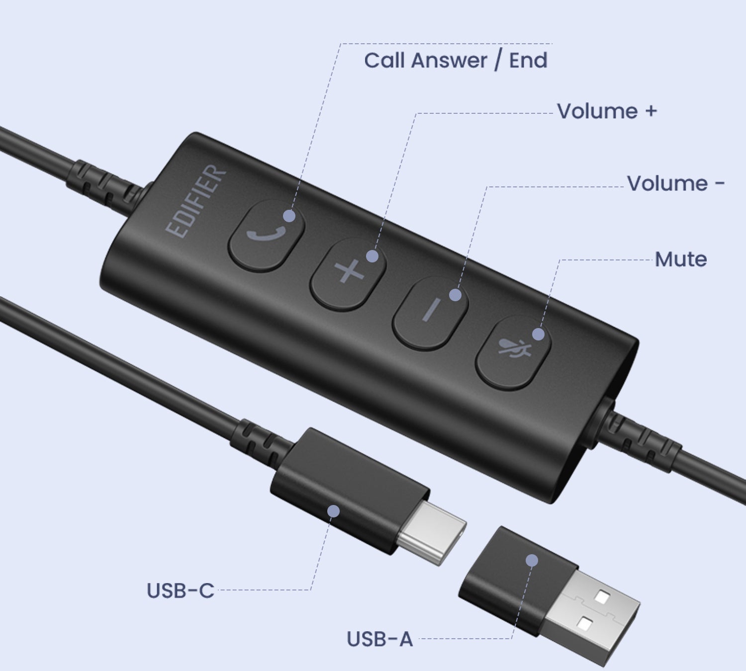 รองรับพอร์ต USB-C และ USB-A ใช้งานกับอุปกรณ์ได้หลากหลาย พร้อมปุ่มควบคุมบนสาย ใช้งานง่ายทั้งรับสาย ปิดเสียง และปรับระดับเสียง