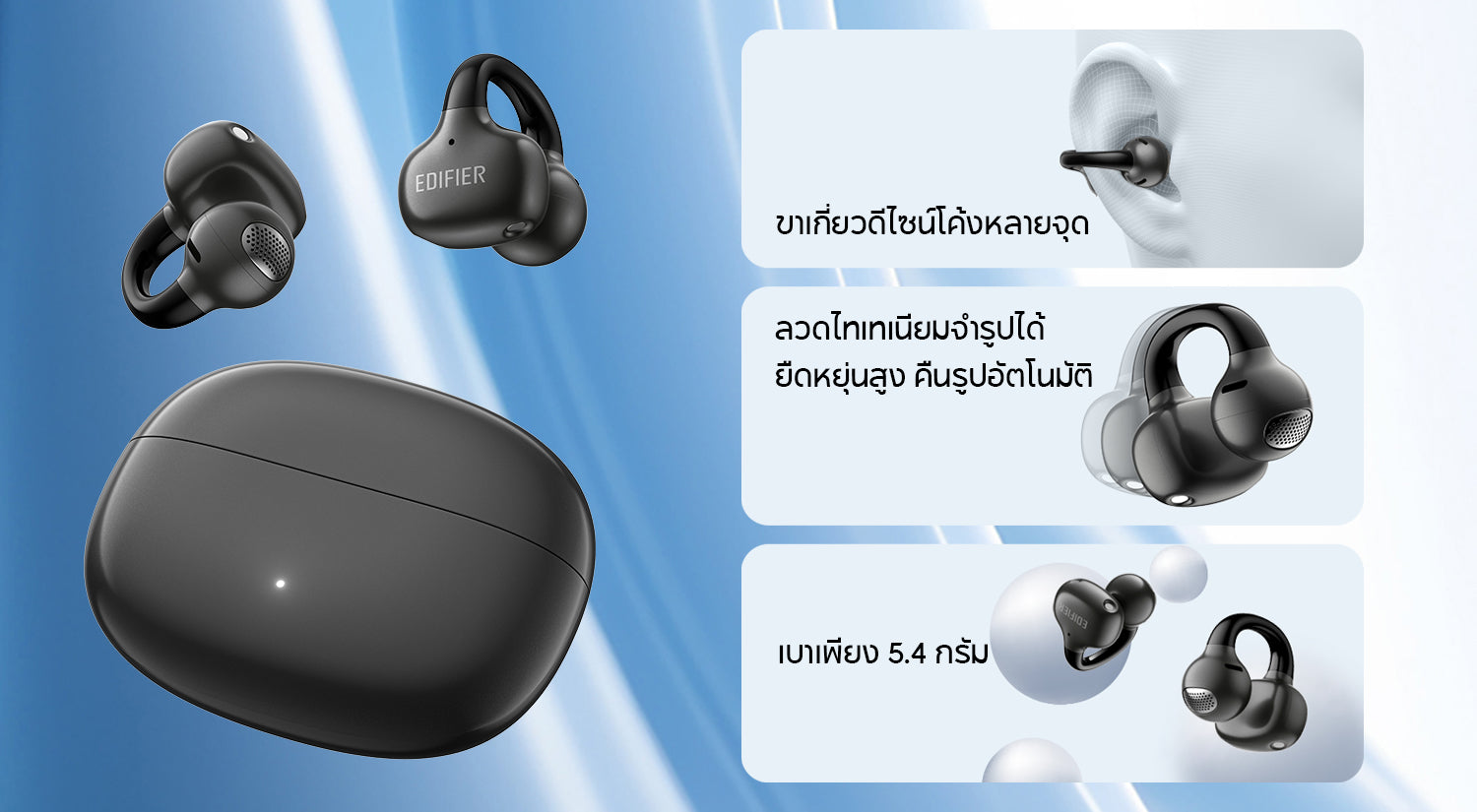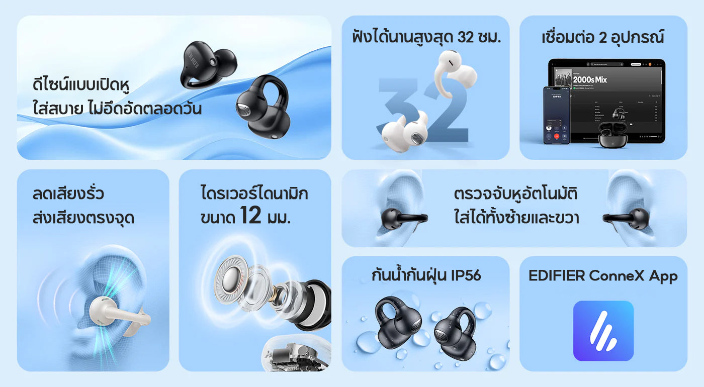 【ดีไซน์เปิดหูแบบคลิปออน ใส่สบายตลอดวัน】:ขาเกี่ยวแบบหลายจุดช่วยให้กระชับกับใบหู รองรับรูปทรงหูที่หลากหลาย สวมใส่มั่นคง ไม่อึดอัด พร้อมระบบเซ็นเซอร์ 3 แกน ตรวจจับการใส่หูฟังโดยอัตโนมัติ และสลับช่องเสียงซ้าย/ขวาได้ตามข้างที่ใส่จริง
