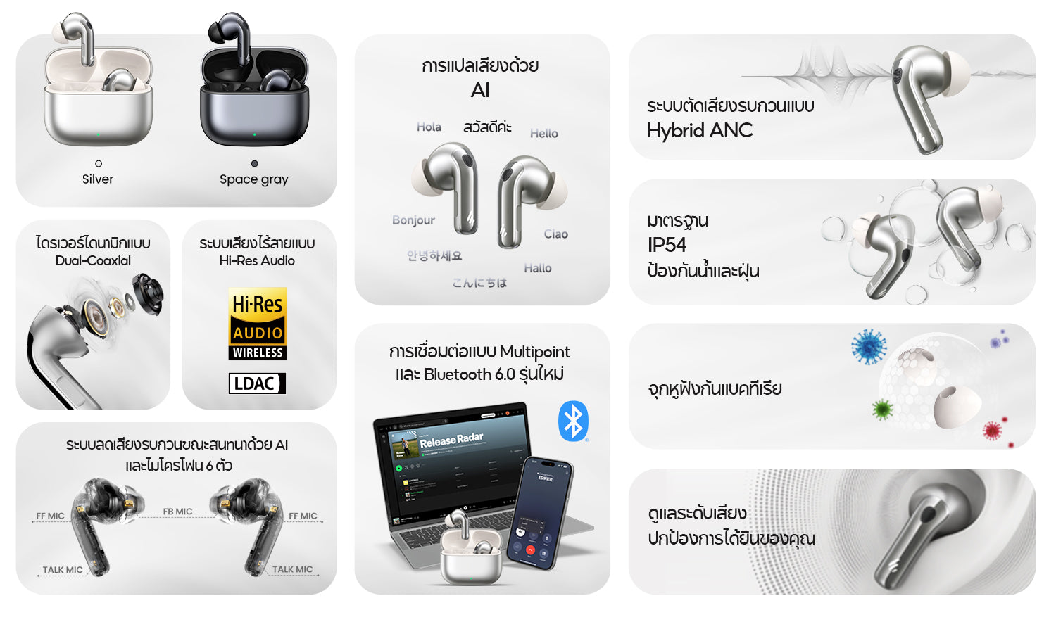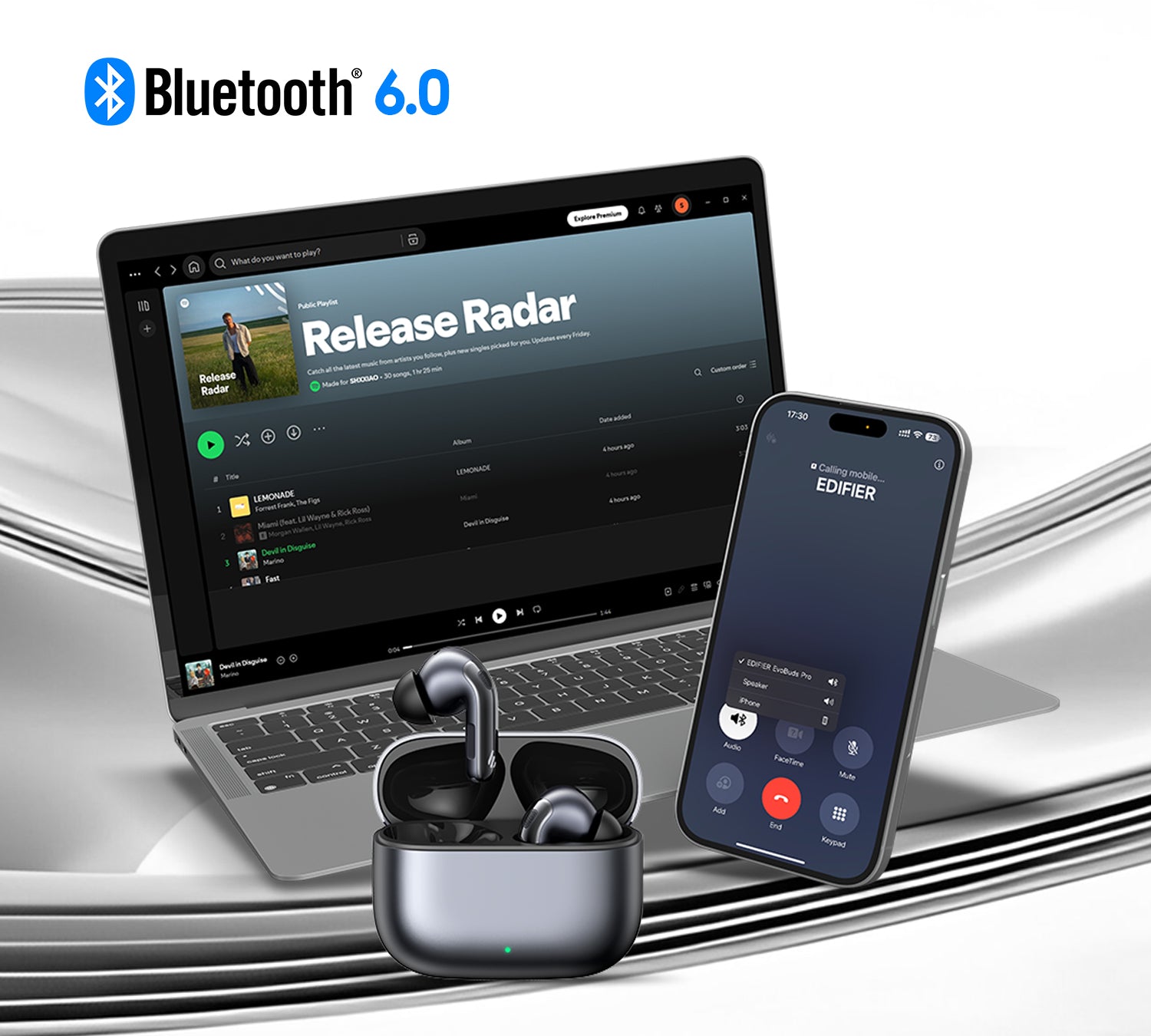 รองรับการถ่ายโอนข้อมูลที่เสถียรและหน่วงต่ำด้วย Bluetooth 6.0 พร้อมการสลับระหว่างอุปกรณ์ที่เชื่อมต่อสองเครื่องได้อย่างไร้รอยต่อ เชื่อมต่อได้อย่างต่อเนื่องระหว่างโทรศัพท์ แท็บเล็ต หรือแล็ปท็อปโดยไม่มีการขัดจังหวะ