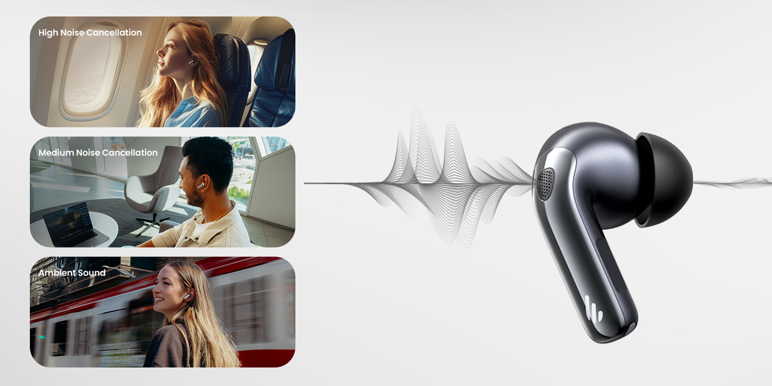 ลดเสียงรบกวนจากสิ่งแวดล้อมได้สูงสุดถึง -48dB ด้วยระบบ ANC แบบผสมและไมโครโฟนคู่ โหมดควบคุมเสียงหลายโหมดช่วยให้เหมาะสมกับทุกสภาพแวดล้อม ไม่ว่าจะเป็นการเดินทาง, บิน, หรือทำงาน หากคุณต้องการรักษาความระมัดระวัง โหมด Ambient จะช่วยให้คุณได้ยินเสียงรอบข้าง เช่น การสนทนาหรือเสียงการจราจร โดยไม่จำเป็นต้องถอดหูฟังออก