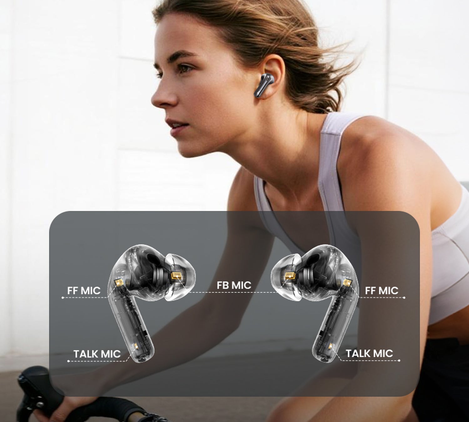 ไมโครโฟน 3 ตัวในแต่ละข้างทำงานร่วมกับอัลกอริธึม AI เพื่อแยกเสียงพูดจากเสียงลมและเสียงรบกวนรอบข้าง แม้ในความเร็วสูงถึง 21 กม./ชม. ก็ยังคงให้ความชัดเจนในการโทรที่ยอดเยี่ยมในทุกสภาพแวดล้อม