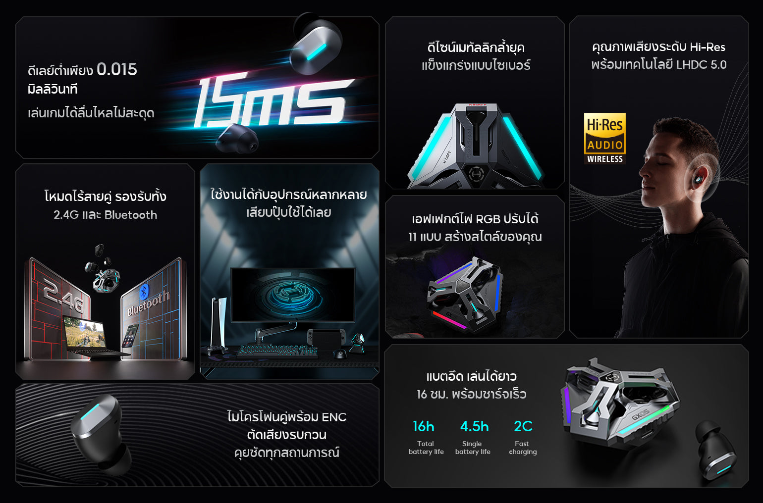 เทคโนโลยี 2.4G ช่วยลดค่าความหน่วงของเสียงให้ต่ำสุดเพียง 15 มิลลิวินาที มอบประสบการณ์ไร้สายที่รวดเร็ว รองรับการใช้งานกับอุปกรณ์หลากหลายเพื่อความเพลิดเพลินอย่างไร้รอยต่อ