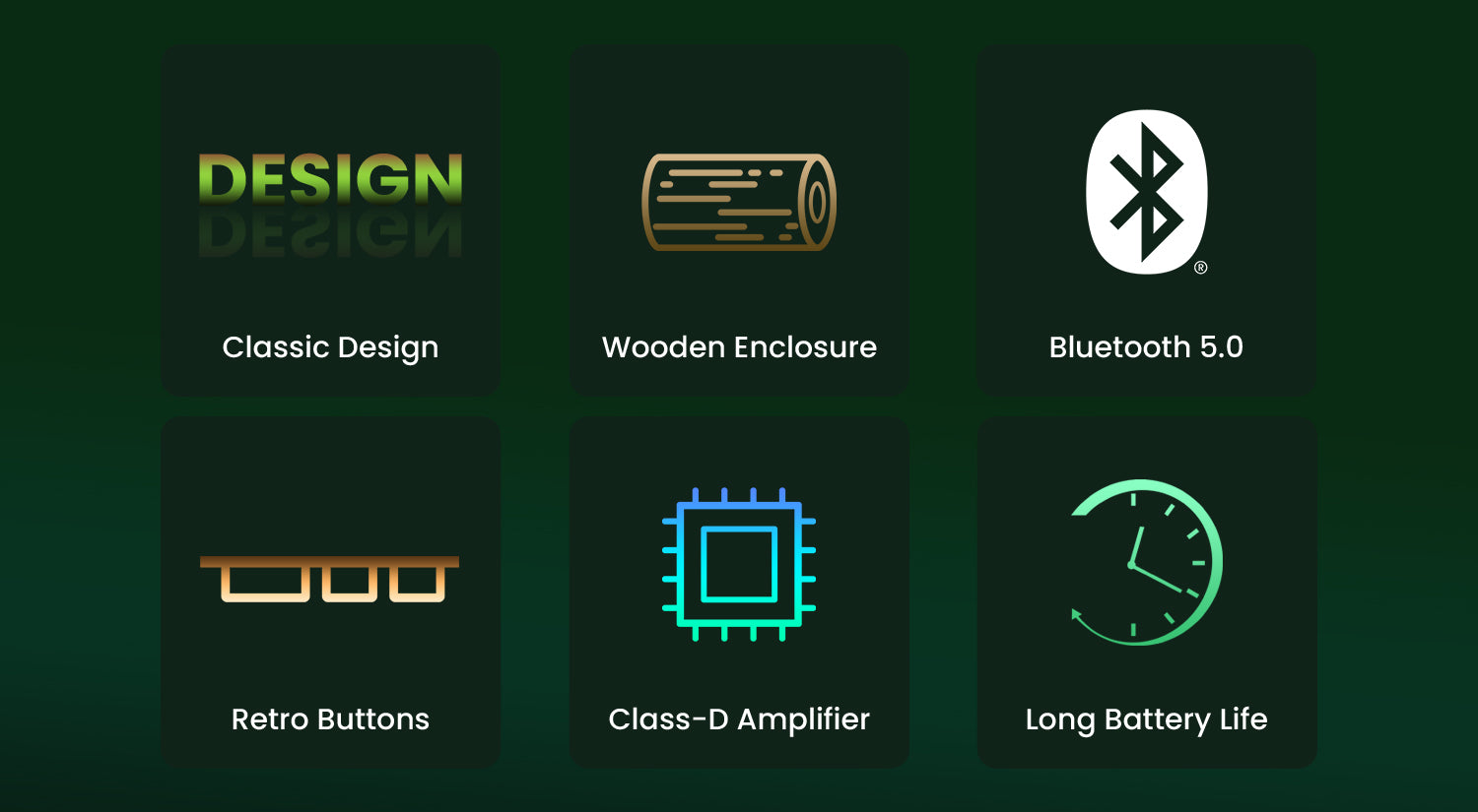ได้แรงบันดาลใจจากวิทยุคลาสสิกยุค 50–60 พร้อมปุ่มกดทรงเปียโนที่ออกแบบอย่างพิถีพิถัน ผสานกับโทนสีคลาสสิกและตะแกรงหน้าดีไซน์เฉพาะ