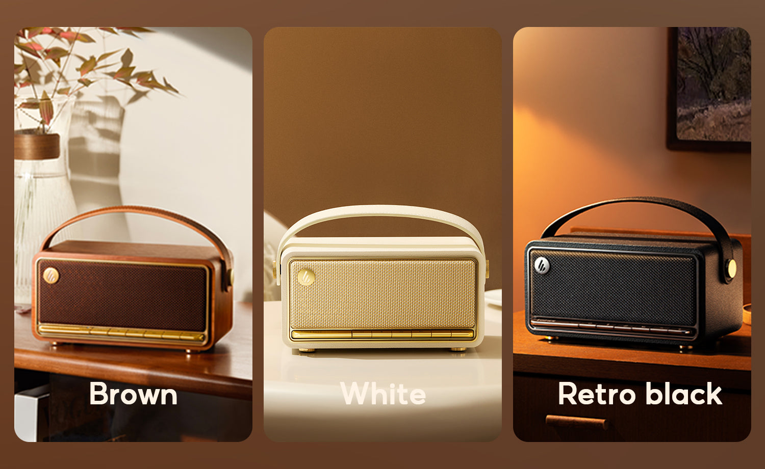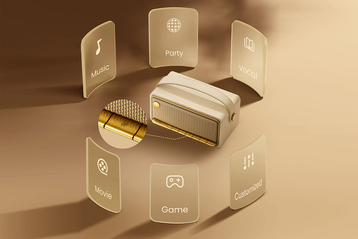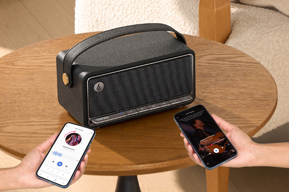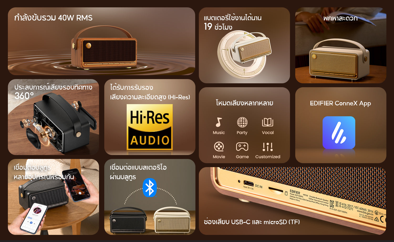 【ดีไซน์วินเทจพกพาง่าย รองรับแอป】:ตัวเครื่องสไตล์วินเทจพร้อมหูหิ้วหนังเทียม ดูดี น้ำหนักเบา พกพาสะดวก รองรับการควบคุมผ่านแอป EDIFIER ConneX สำหรับปรับ EQ และเอฟเฟกต์แสงอย่างอิสระ