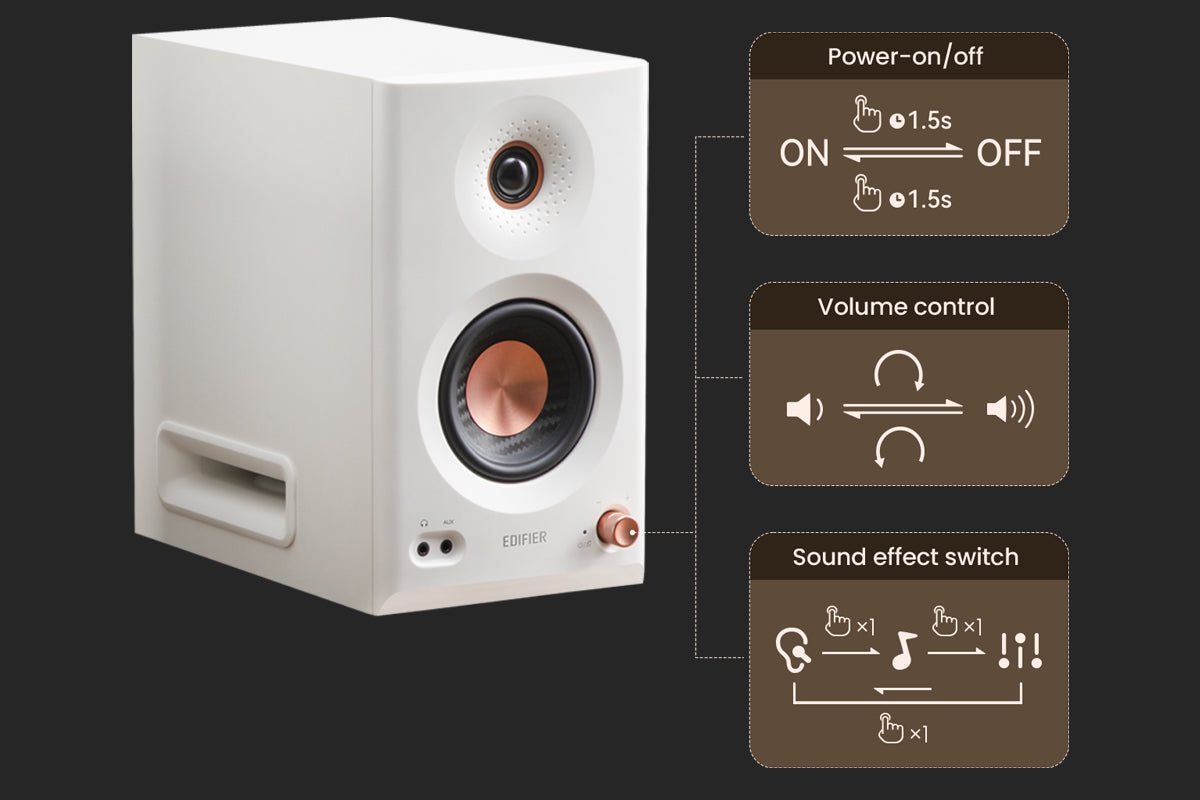 【ปรับเสียงตามสภาพห้อง】: ปรับ EQ และ Room Compensation ได้ผ่านปุ่มด้านหลังหรือแอป EDIFIER ConneX บนมือถือ