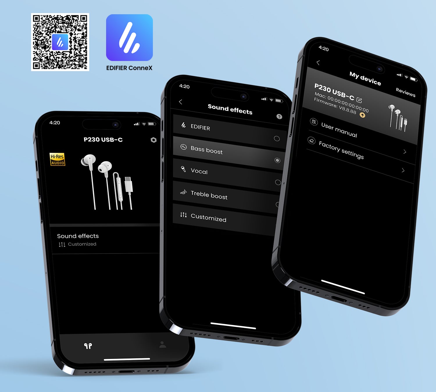 ควบคุมเสียงได้อย่างอิสระด้วย EQ ที่ตั้งค่าไว้ล่วงหน้า 4 รูปแบบ และการปรับแต่ง EQ แบบละเอียดผ่านแอป เพื่อสร้างประสบการณ์เสียงที่เหมาะกับสไตล์ของคุณ