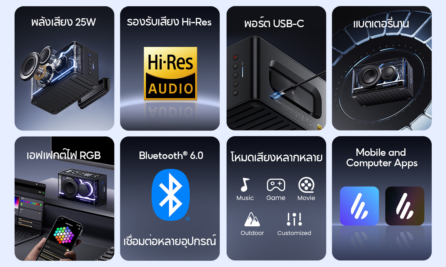 - 【ใช้งานได้นานกว่า 15 ชม. พร้อมพอร์ต USB-C】: เล่นเพลงต่อเนื่องได้นานกว่า 15 ชั่วโมง (ที่ระดับเสียง 50% และปิดไฟ) พร้อมพอร์ต USB-C ชาร์จเร็วใช้งานง่าย