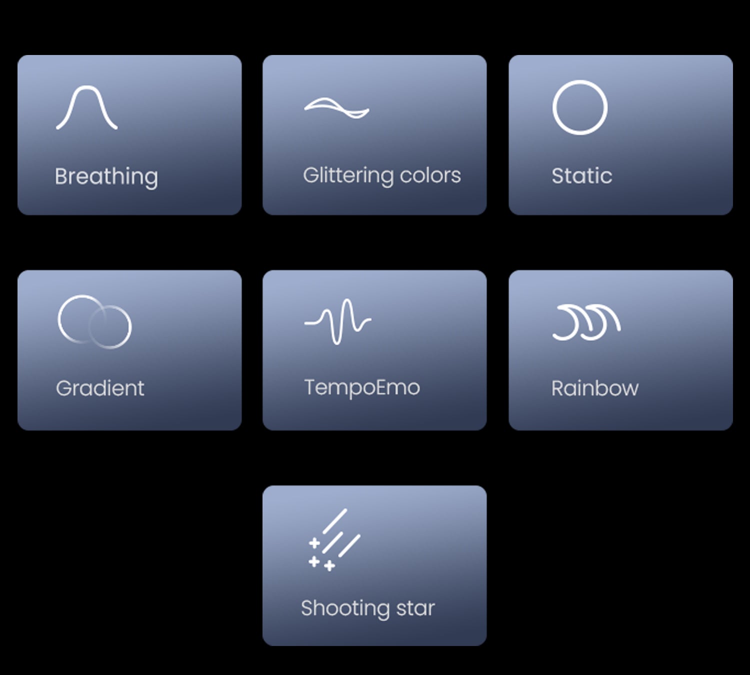 มีโหมดไฟให้เลือกถึง 7 แบบ ได้แก่ Breathing, Glittering colors, Static, Gradient, TempoEmo, Rainbow และ Shooting star เพื่อให้เข้ากับทุกอารมณ์และการใช้งาน