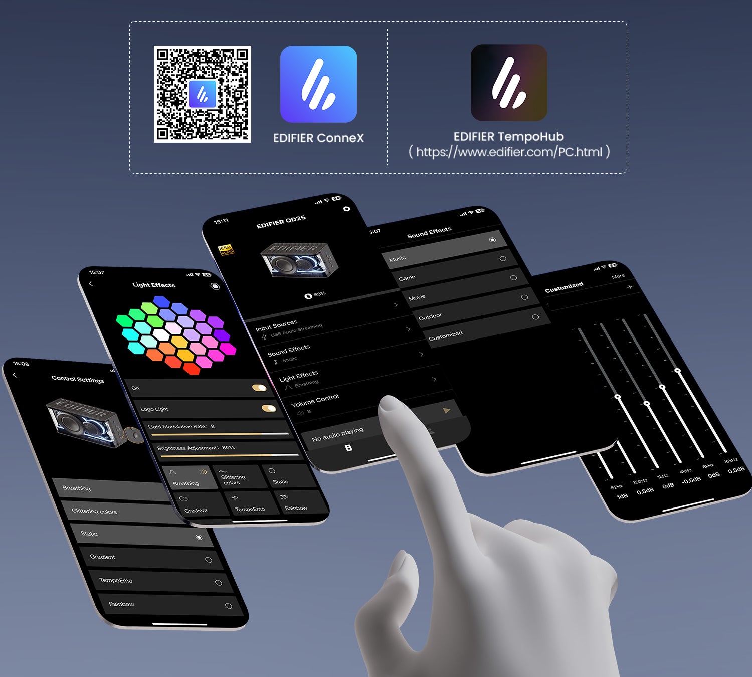 ดาวน์โหลดแอป EDIFIER ConneX บนมือถือ หรือ EDIFIER TempoHub บนคอมพิวเตอร์ เพื่อปลดล็อกฟีเจอร์เพิ่มเติม เช่น การสลับแหล่งเสียง การควบคุมการเล่น การปรับแต่งเสียงและไฟ และเข้าถึงคู่มือการใช้งาน