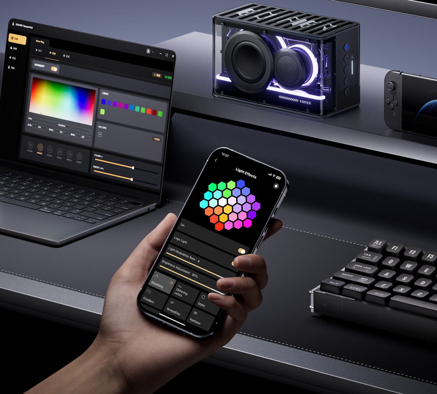 - 【ควบคุมง่ายผ่านแอป EDIFIER】: รองรับแอป EDIFIER ConneX และ TempoHub สามารถปรับแต่งเสียงและแสงได้ตามต้องการ