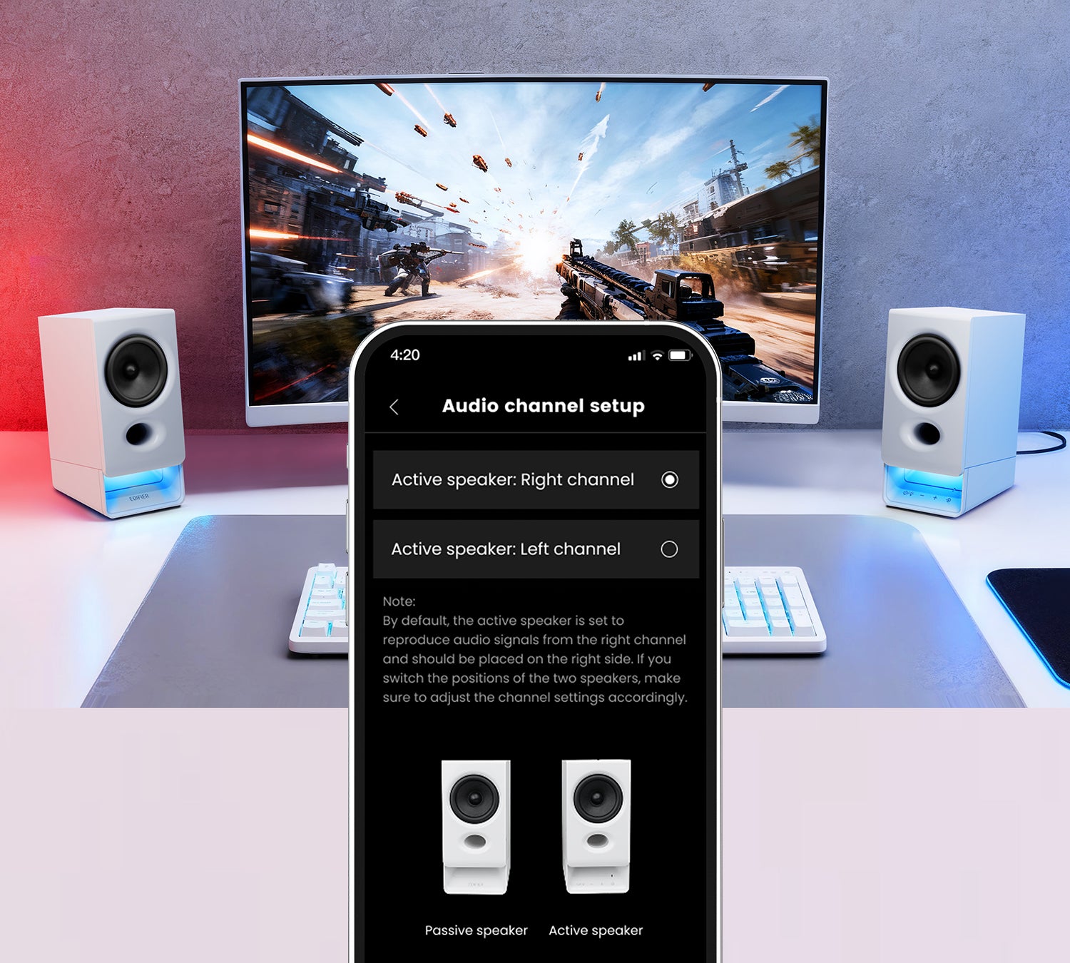 ลำโพงมาพร้อมสายเชื่อมต่อยาว 1.8 เมตร และสาย USB ยาว 1.5 เมตร เหมาะสำหรับโต๊ะทำงานขนาดใหญ่ สามารถสลับตำแหน่งช่องเสียงซ้าย–ขวาได้ง่ายผ่านแอป เพื่อความยืดหยุ่นในการจัดวางลำโพง