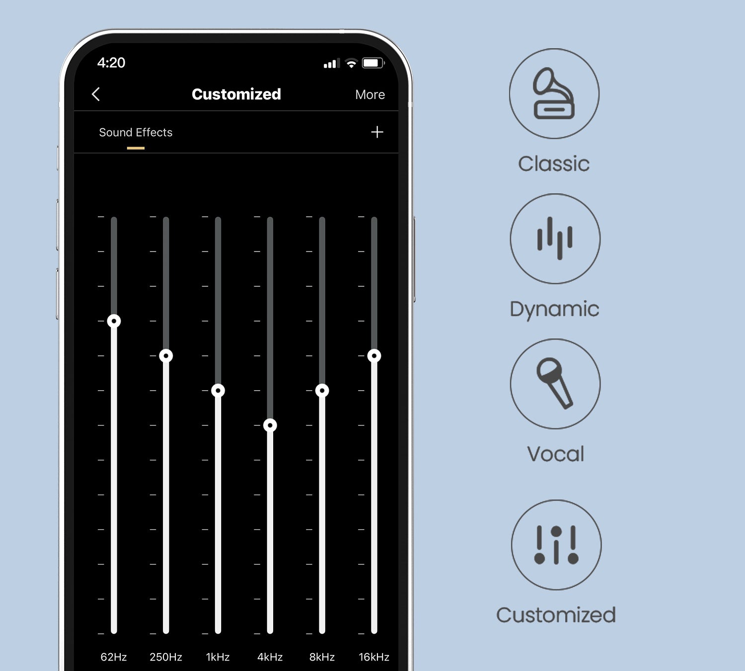 เลือกโหมดเสียงที่ตั้งค่าไว้ล่วงหน้า 3 แบบ ได้แก่ Classic, Dynamic และ Vocal หรือปรับแต่งโปรไฟล์เสียงของคุณเองผ่านแอป เพื่อประสบการณ์การฟังที่ตรงกับความต้องการมากยิ่งขึ้น