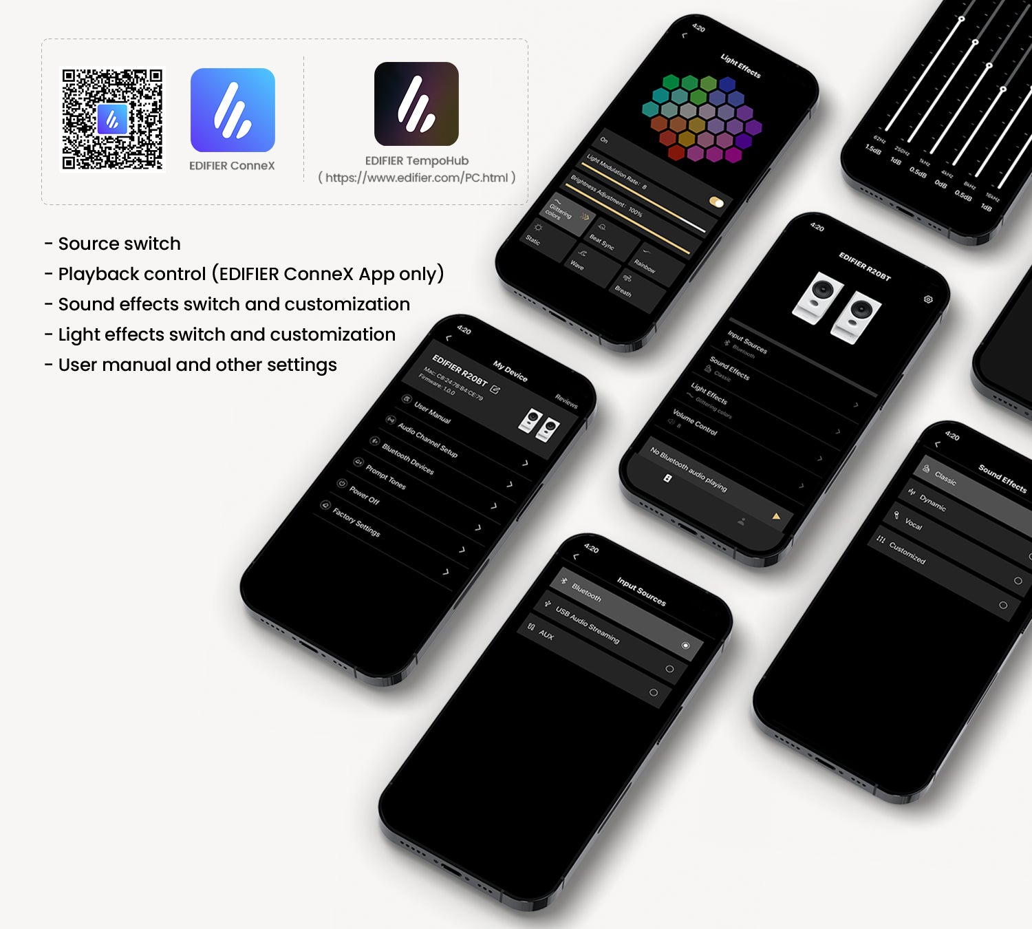 - ดาวน์โหลดแอป EDIFIER ConneX สำหรับมือถือ หรือแอป EDIFIER TempoHub สำหรับคอมพิวเตอร์ เพื่อใช้งานฟังก์ชันเพิ่มเติม