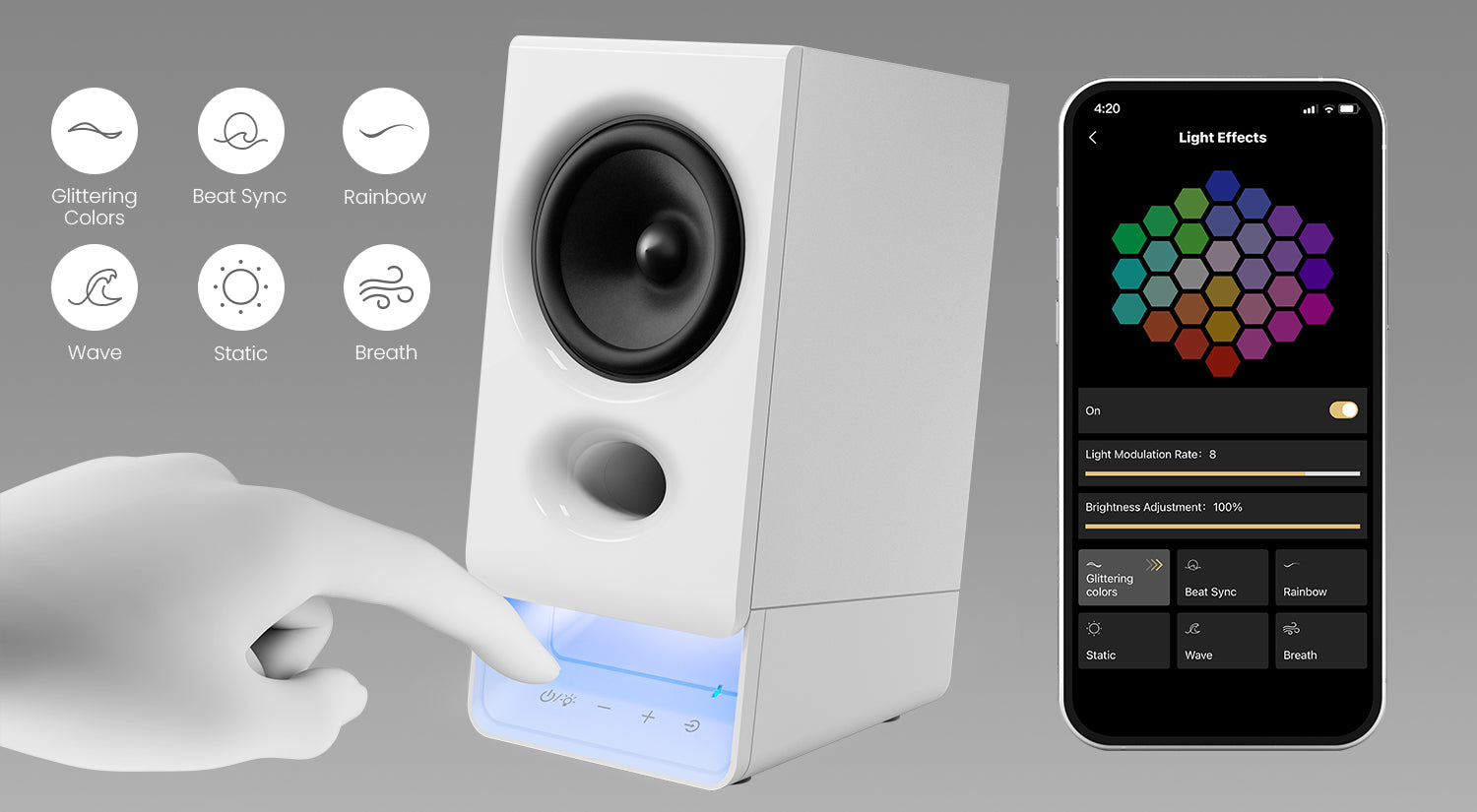 เลือกใช้งานเอฟเฟกต์แสงที่ตั้งค่าไว้ล่วงหน้าหลากหลายรูปแบบ หรือปรับแต่งรูปแบบแสงของคุณเองผ่านแอปบนมือถือหรือคอมพิวเตอร์ เพิ่มบรรยากาศให้โต๊ะทำงาน และเปลี่ยนหรือปิดเอฟเฟกต์แสงได้อย่างง่ายดายด้วยปุ่มควบคุม