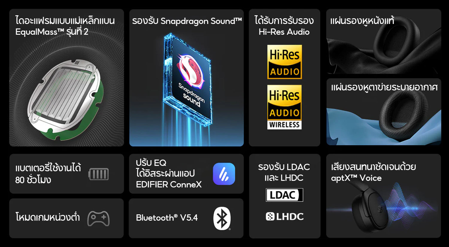 - 【Hi-Res Certified พร้อม aptX Lossless】: รองรับ Snapdragon Sound™, aptX Lossless, aptX Adaptive, LDAC และ LHDC ให้คุณภาพเสียงระดับสูงแบบไร้สาย พร้อมการรับรองทั้ง Hi-Res Audio และ Hi-Res Wireless