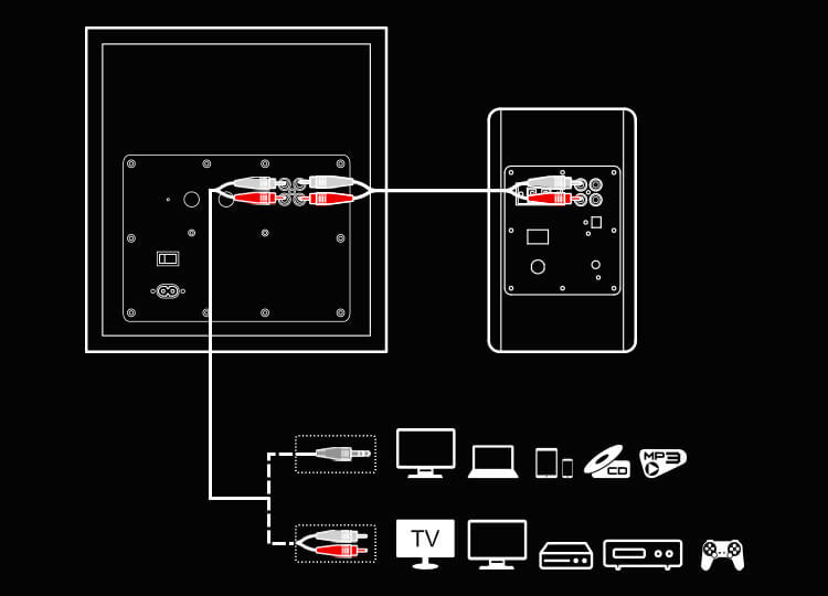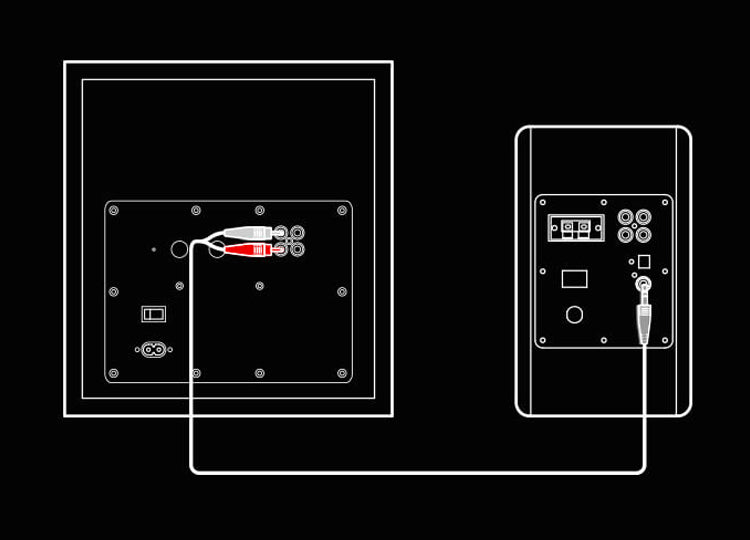 เชื่อมพอร์ตซับวูฟเฟอร์ของลำโพงหลักเข้ากับพอร์ต Signal In ของซับวูฟเฟอร์ จากนั้นต่อสายจากลำโพงหลักไปยังแหล่งเสียง