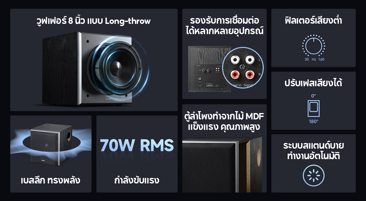 • 【ระบบตัดความถี่และควบคุมเฟสแม่นยำ】DSP ในตัวช่วยจัดการ Low-pass Filter และ Phase Control ให้ทำงานกลมกลืนกับลำโพงหลักได้อย่างลงตัว