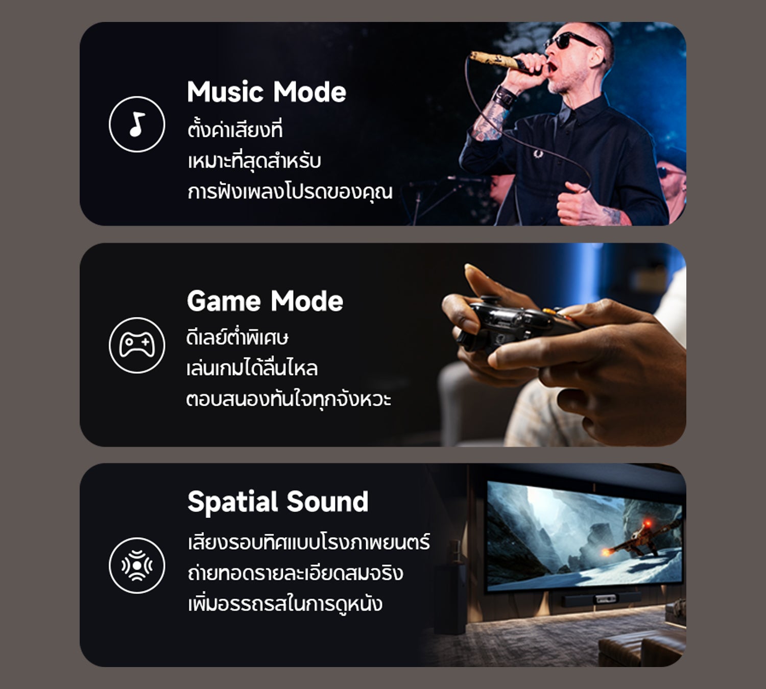 สลับใช้งานได้ทั้งโหมดฟังเพลง โหมดเกม และเสียงรอบทิศทางตามความต้องการ ให้เสียงที่ปรับมาอย่างเหมาะสม ไม่ว่าจะฟังเพลง เล่นเกม หรือดูหนัง—all in one!