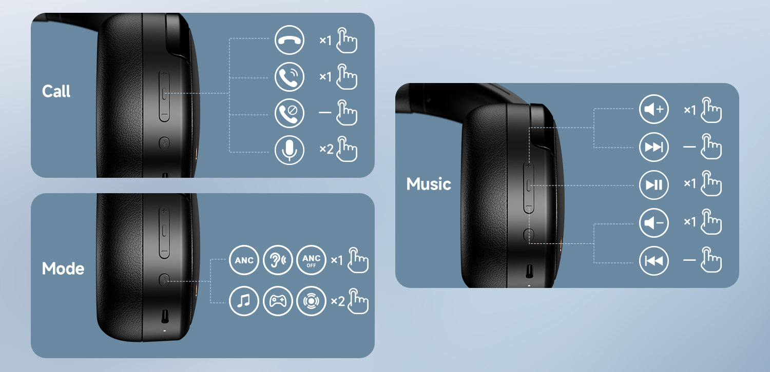 ควบคุมการโทร เพลง และโหมดเสียงได้อย่างง่ายดายด้วยปุ่มกด รับสาย ปรับระดับเสียง เปลี่ยนเพลง หรือสลับโหมด ANC และโหมดเสียง ได้สะดวกในไม่กี่ขั้นตอน