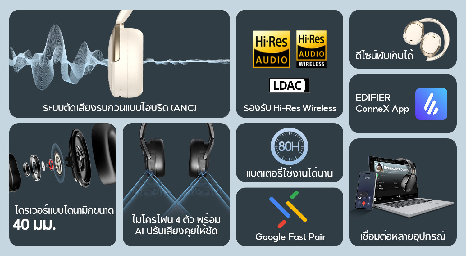 【คุณภาพเสียง Hi-Res พร้อมไดรเวอร์ทรงพลัง】:ใช้ไดรเวอร์แบบไดนามิกขนาด 40 มม. เคลือบไทเทเนียม รองรับมาตรฐาน Hi-Res Wireless และ LDAC/SBC ให้คุณภาพเสียงระดับมืออาชีพ