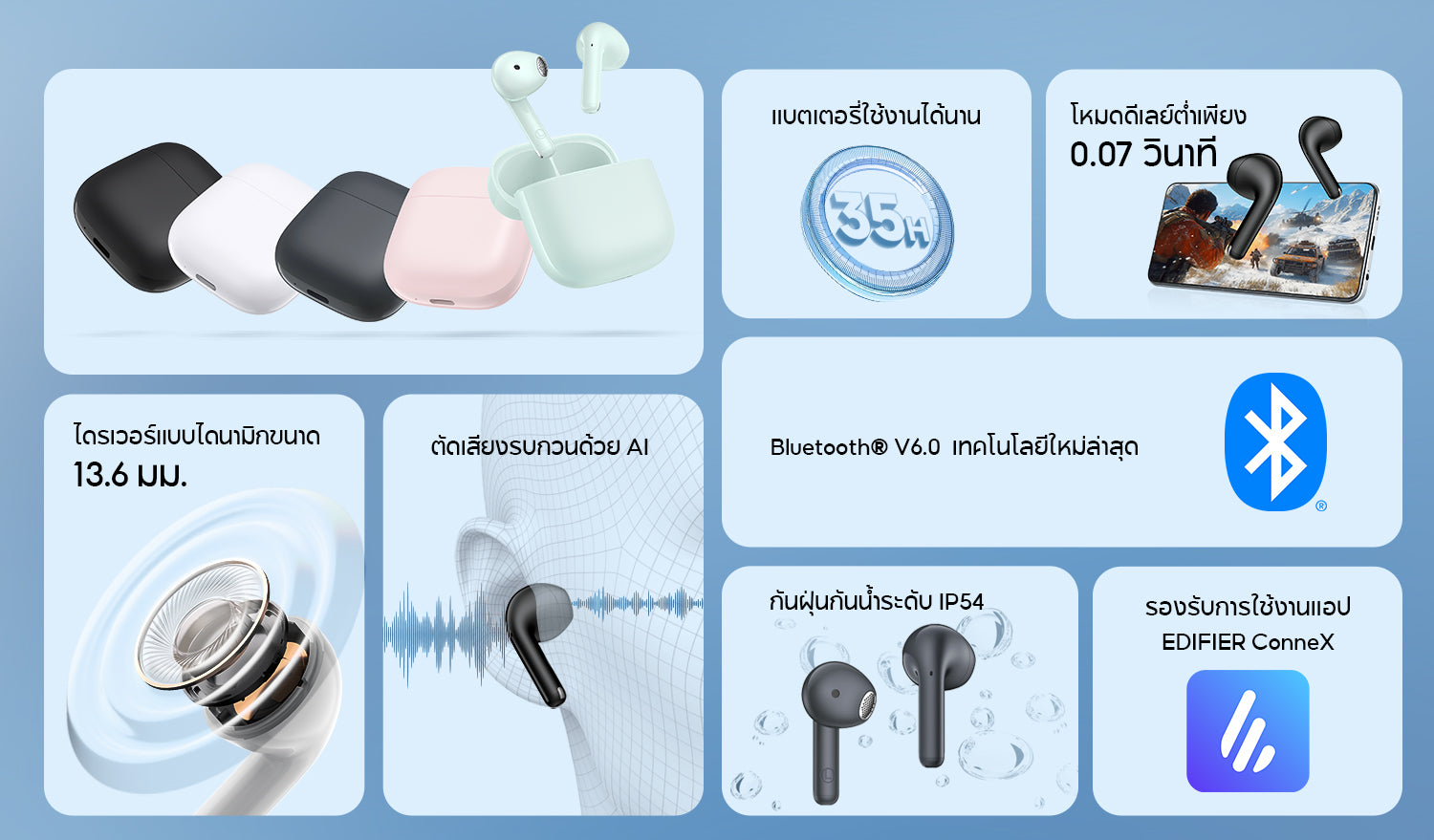 【ทนทานและปรับแต่งได้ผ่านแอป】:กันฝุ่นกันน้ำระดับ IP54 ใช้งานได้ทุกวันแม้ในสภาพแวดล้อมที่หลากหลาย รองรับแอป EDIFIER ConneX ปรับเสียงและควบคุมฟังก์ชันได้ตามต้องการ