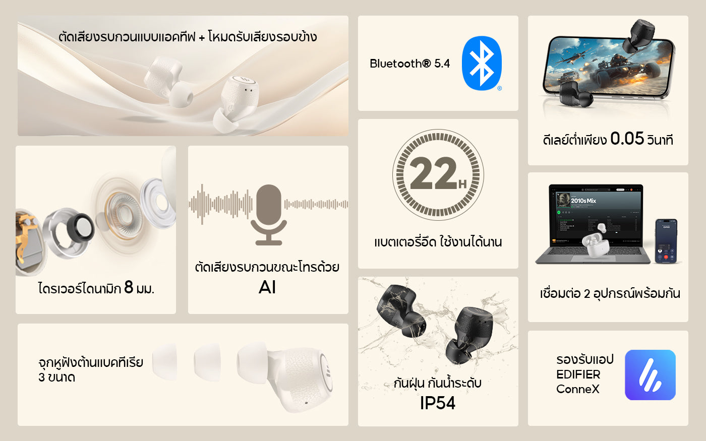 - [การควบคุม]: ปรับแต่งการใช้งานผ่านแอป EDIFIER ConneX ได้อย่างอิสระ