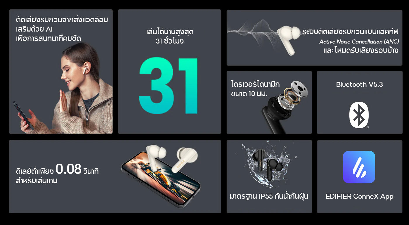 * ข้อมูลจากห้องทดลอง Edifier ที่ระดับเสียง 80% โดยใช้การถอดรหัสเสียงแบบ AAC